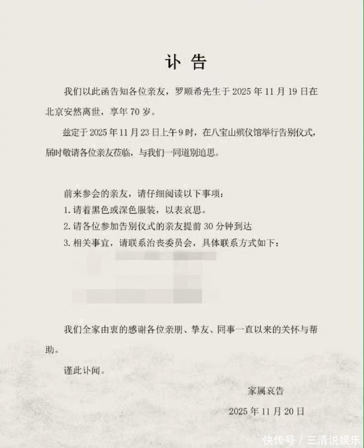 11月19日去世,11月23日将在北京八宝山殡仪馆举行告别仪式,届时敬请各位亲友莅临,与他们一同道别追思。罗晋父亲在北京去世,这就说得通为什么他们夫妻会两地分居,罗晋不仅要完成工作,还要照顾父亲,所以根本没有时间回到上海家里。