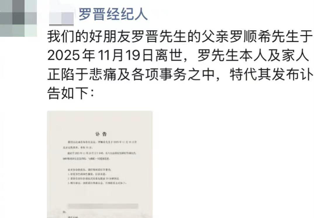 罗晋的经纪人发朋友圈,罗晋的父亲患病去世,享年70岁,去世的时候正是婚变传闻炒得最厉害的时候,也就是11月19日,罗晋及家人都陷于悲痛及各项事务之中,经纪人代其发布讣告。